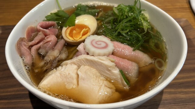 ラーメンカフェ週替りは「冷やしとうもろこしつけ麺990円」、相見えんと勇んで訪れドアを開けようとしたら鍵がかかっている。大将、仕込みに集中して鍵開けるの忘れていた模様。2回目だ。1人でやっているから集中すると忘れちゃうんだろう。という事で気を取り直して週替りオーダーしようとしたら大将から実は…と切り出されたのは、好評で昨日で週替り全て売り切れた⁈との事。Instagramで見たビジュが美味しそうだったからとても楽しみにしていたのだがないものは仕方ない。しかし、つけ汁にとうもろこし2本使っていたという話を聞かされるとこの取りこぼしは痛い。落ち込んでいても仕方ないので定番の「蕎麦だしラーメン890円+チャーシュートッピング100円」を注文。前にも書いたが狭山ヶ丘で蕎麦ダイニングを営んでいる大将のルーツの一杯。たまには初心に帰るのも有りだ。先ずはスープ、以前より角が取れまろやかさを感じる、うん、こっちの方が好み。具材も定番の2種類のチャーシューに煮卵、ナルト、太ネギ。鶏むね肉のチャーシューが奥行きのあるスープに合う。全体的は完成度は高い。帰りしな店長にスープの味が以前よりまろやかになったね、と言ったら出汁をちょっと変えたとの事。料理に終点はなく、日々より良いものを目指して研鑽なさっているんだな。とうもろこしは残念だったけど、蕎麦だしラーメン改を食べられてラッキー、ご馳走さまです♪