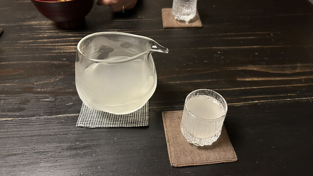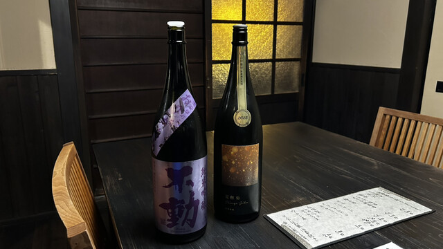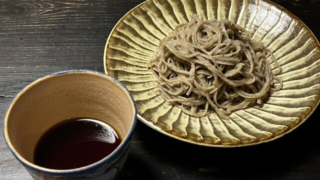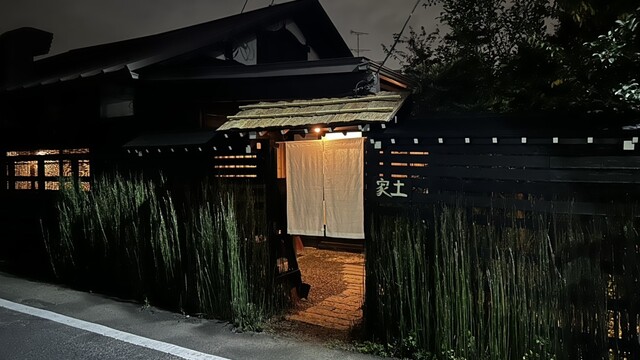この時期の18時は薄暮はとうに過ぎ人通りの少ない路地は所々街灯が宵闇に浮かぶ。用水路を跨ぐ橋を渡ると闇を遮る結界の様な真っ白い暖簾が目に入った。「家土」と買いた屋号が暖簾の右に見て取れる。東村山の駅からは近いのだがバス通りを一本横に入った先は暗く、闇の中に浮かぶ白い暖簾は異界へと繋がる入口の様に感じた。暖簾を潜ると石畳の先にはひどく懐かしい引き戸があり、暖かそうな灯りが溢れている。引き戸を開けるとかつては土間であったろう玄関口、こんばんは、と声をかけると同時に女将がお待ちしておりました、と顔を出しテーブル席に案内される。どうやら今夜の客は我々老夫婦一組だけらしい。アウターをハンガーにかけ腰を下ろして室内を見渡す。古民家を改装した店内は簡素だが充実した趣き。時間をかけて人が手を入れたものだけが醸し出す贅沢さを感じる。ハートランドビールで渇いた喉を潤していると最初に一品が運ばれてくる。蕎麦粉を使ったがんもどきに毛蟹の餡がかかった温かい椀もの。冷えた胃が温まり準備が整う。ビールを飲み干して日本酒に切り替える。メニューにある4種以外に「山田錦無濾過生原酒 電照菊」と「純米吟醸 不動」がありますとの事で両方とも頂く事にする。2品目は蕎麦豆腐を湯葉で覆いイクラをかけた冷たい椀。三者三様の風味と食感が口の中で対峙して混ざり合う。優しい塩味が広がり旨みが顔を覗かせる。そこにフルーティな電照菊を流し込む。米麹の爽やかな香りが満ちて甘味のハーモニーが響く。美味しい。右手には昔ながらの磨りガラスと透明ガラスが嵌められた引き戸があり、薄暗い庭に漏れた光に照らされた木が映る。美味しさと懐かしさが邂逅する瞬間。昭和の頃の記憶も流れる。家内との会話も自然磨りガラスの思い出。昨今は全く目にすることがなくなった。3品目、松茸と蕎麦がきと鴨のつくねと生麩の温かい椀。松茸の香りが立つ。電照菊から不動へと飲む酒も変わった。早い、かな。不動は濁ったお酒、口当たりが良い。蕎麦がきと鴨つみれを一緒に頬張ってからの不動、このコンビネーションは破壊力抜群。家内も真似する。笑美が零る。次いで出されたのが八寸的なお皿。これは凄い。カリフラワーのポタージュ、舞茸としめじの和物、牡蠣と海老芋の揚げ物など11種。カリフラワーのポタージュと牡蠣をすり身にした揚げ物は初めての味。お酒が進む。「純米大吟醸 さび猫ロック」を追加。これもまた飲み口が良い。家内はこれが一番美味しかった模様。食事の部、蕎麦前最後は揚げ物、鯵、焼き芋、舞茸をお塩で頂く。鯵の火の通しが絶妙、レアな食感が堪らない。そして蕎麦。鰹の香りが良いつけ汁に細切りツルシコ蕎麦をつけ啜る。口の中に蕎麦の風味が広がる、さらに喉越しでも味わう。美味い、日本に生まれて本当に良かったってしみじみ思う。薬味に添えられた辛味大根のおろしをつけ汁に混ぜて蕎麦を啜る。蕎麦におろしが絡みまた違った味わい。散々飲んで食べたが、このひと啜りの為に周到に準備されたものであったと改めて気付かされる。蕎麦湯を辛味大根のおろしの入ったつけ汁に加え混ぜて飲み干す。ふうぅっと息を吐く。満足満足。そして締めはシャインマスカットとピュオーレのジュレに洋梨のソルベ。控えめなフルーツの甘味が爽やかに広がる。焙じ茶を口に運びながら思う。華美なものや気を衒ったものは全くないが時間という名の試練から凛として朽ちることなく「在り」続けた古民家で体験する食を通した一連の感情の揺らぎは「芸術」であったと。素晴らしい、ただ淡々と素晴らしいと思う。これはインスタレーションだ。また絶対に来よう、ご馳走さまです♪♯♯♯