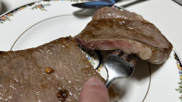 実は明日で64歳なんだよね、別に祝ってくれってわけじゃなくて、そんな日の1日前、つまりバースデーイブだから自分にご褒美って訳でちょっとだけ良いお肉を食べようと狭山ヶ丘の「肉匠もりやす」さんにステーキ用のお肉を買いに来たって訳。それでもって買ったのは火曜日だったんだけど、なんとサーロインが2割引!これは大きな購入動機になるよなって事で、自分用と家内に200gを2枚購入。グラム1,600円だから通常だったら6,400円のところ2割引で5,120円!それでバースデーイブの今夜フライパンで焼いて食べている訳だが、霜降りが還暦オーバーの身には強烈過ぎる。甘くて美味しいけど量は行けない。たまには良いかなって思ったけど、身体が、てか胃腸が気持ちについていけてない事を自覚し、コーヒーでリセットしました。でももりやすさんは所沢西武にもお店出しているし、牛も一頭買いで仕入れるこの辺りじゃお勧めのお店、メンチカツは150円と激安だけど肉肉しくてとても美味しいんだよね。自家製コンビーフ1,600円もとても旨そうだから次回は買ってみよう。ご馳走さまです♪♯