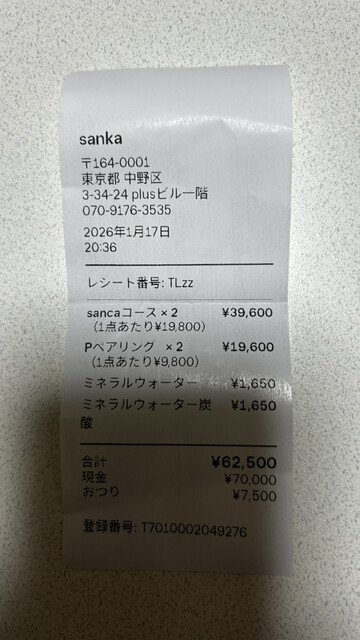 中野レンガ坂に新進気鋭のフレンチが出来たと聞き家内と向かう。18時前のレンガ坂は凛と冷えた空気にイルミネーションが映え、嫌が上にも期待感を高める。横丁に入りすぐ左手にsankaはあった。広々としたカウンター席は全9席。先に女性2人が座っており、我々夫婦を合わせ4人で今宵の宴が始まる。カウンターの向こうにはアイランド型の広いステンレステーブルがでんと置かれており、左手にガスコンロや各種調理器具、背景は大きな木の板で目隠しされているがシンクや冷蔵庫などがありそうだ。右手は何やら変わった装置が目につく。ワインやグラスはカウンター右手の厨房側に保管スペースがある様だ。つまりカウンターに座して調理が進む様を目でも追って体験できるライブキッチンとなっている。センターカウンターでは丁寧に下拵えされた素材たちが古澤シェフの手によって皿の上でタブローの様に描かれていく。確かなテクニックで火入れされ、味付けられた素材が食感や味の違いを感じられる様に緻密に計算され散りばめられる。そして届けられた一皿一皿は水彩画の様であったり、油絵の様であったりしながら舌の上で交わり、複雑な味の混淆が調和して記憶に刻まれる。つまり、時間も計算して蓄積される味の層の重なりも楽しませてくれる。例えばじゃがいもの一皿、異なる複数のじゃがいもを3通りの調理法で三層に重ね合わせている。時空の重層性を閉じ込めることのできる芸術という観点に立つと、料理はその際たるものだ!と思えるのだ。そのタイムカプセルの様な一皿はスプーンを入れる事でビックバンを起こす。そこに至るまでの手間が口の中で再構築される。再構築というワードで思い出したが、二皿目に供されたジビエとコンソメ、パイは伝統的調理法であるパイ包み焼きを数学的に言うなら因数分解して提示して、我々が食する事で再度展開する様な面白さを提示していた、美しさを保ちつつ。旬のクエを熟成させた後、美しいソースを重ね合わせたお皿も印象的だったし、昨年何かと物議を醸した熊、それも羅臼のヒグマのロースを力強く仕上げた一皿も一緒に添えられた野菜たちが愛おしく包み込む様が北海道の大地を感じさせる。そして口直しのリゾットの後、厨房右手に見えた装置が正体を表した。なんとアイスシェービングマシーン!かき氷機だったんだ!ゴルゴンゾーラのシロップで淡雪の様な氷のデザートが供された。甘過ぎず複雑な大人のデザート。夢中で食べてしまった。さて、こうして2時間半の舞台を堪能した訳だが、強く再訪したいと思いつつ、まだ古澤シェフの底が見えないと感じた。確かな技術とコンセプトは持っていらっしゃるが試行錯誤している感じ。きっと一人黙々と突き詰めているのだろう、その解は見つかるかもしれないし見つからないかも知れない。それをまた確かめに行かなくてはならない、と感じた。そう、今夜は俺の誕生日プレゼントで家内にご馳走になった。改めてありがとう、そして古澤シェフとソムリエの方や他のスタッフさん、ご馳走さまでした♪♯