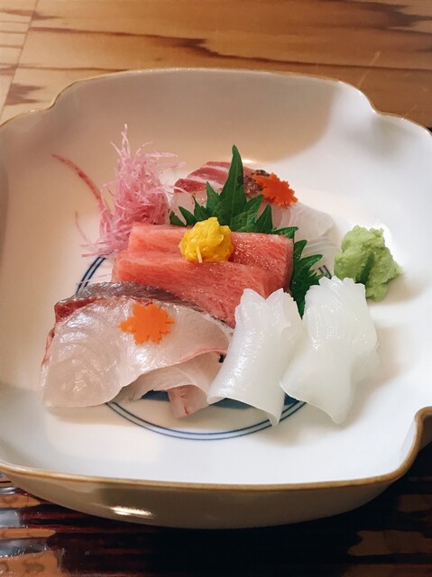 お椀に続いて、お造りをいただきました。マグロ、鯛と烏賊ですが、特にこの烏賊はねっとりしていて柔らかく美味しい。胡麻油と塩、レモン塩、醤油のツケだれで味の変化を楽しめました。