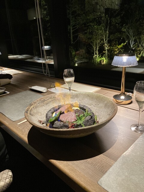 食事は夕食も朝食も「山のは」で、旬を感じる魅力的な食材を用いた料理をいただけます。ふふの他の施設と同じく席は二人の場合にはほとんどが横並びスタイルです。テーマは、薪、汁物、山の幸、海の幸、鮮、溶岩、香草、食事、水菓子。器も盛り付けも趣向を凝らしていて、溶岩では卓上で火の演出もあって、終始ワクワク感を与えることを意識しているのは素晴らしです。