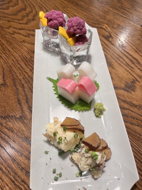 紅白の蒲鉾他に、茹で枝豆といぶりがっこのポテトサラダ。しっかりとした弾力と上品な甘みの蒲鉾をわさび醤油でいただく。まろやかなジャガイモと燻製香のコリコリとした食感のたくあんのコントラストが楽しめる前菜。