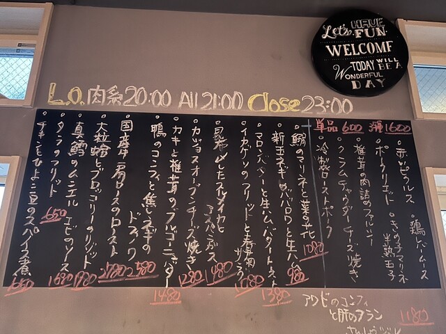 固定の料理メニュー表はなく、その日の仕入れ状況によって書き換えられる黒板メニューのみというスタイル。写真撮影させていただき、席でじっくりとオーダーを検討。