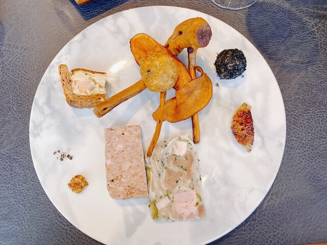 前菜盛り合わせは、イカ墨とパン粉、ゼリー寄せ、エスカルゴを使ったクリームフライ、パテドカンパーニュ、サーモンのキッシュ、さつまいもチップス…どれも凝っていて本当に美味しい!ゼリー寄せは旨みもあり、さつまいもチップスはサクサクで美味しかったです。