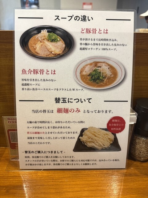 魚介豚骨ラーメンは細麺でスープは豚骨と魚介のWスープ、細麺によく絡んで、こっちの方が好きかも