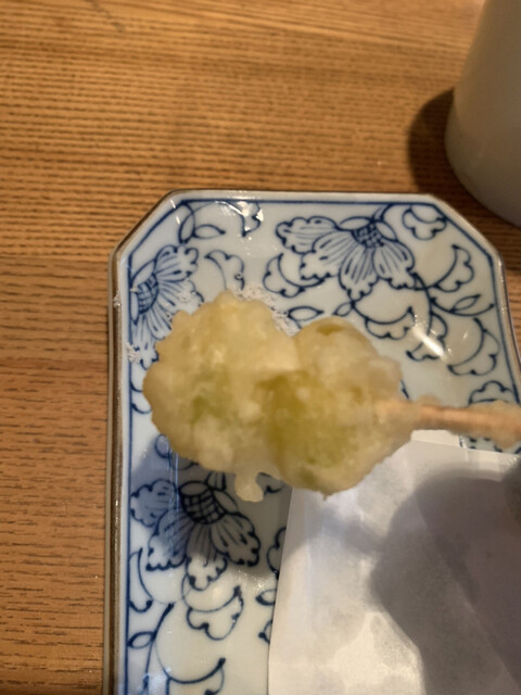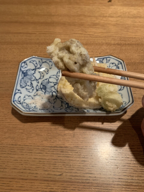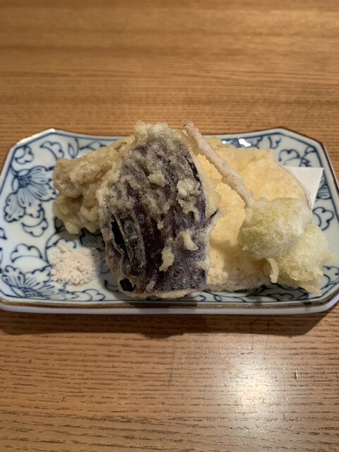 「天ぷらです。藻塩をつけて召し上がって下さい」