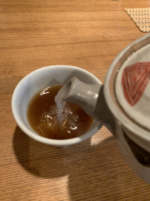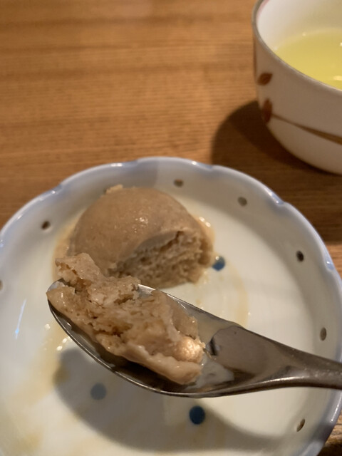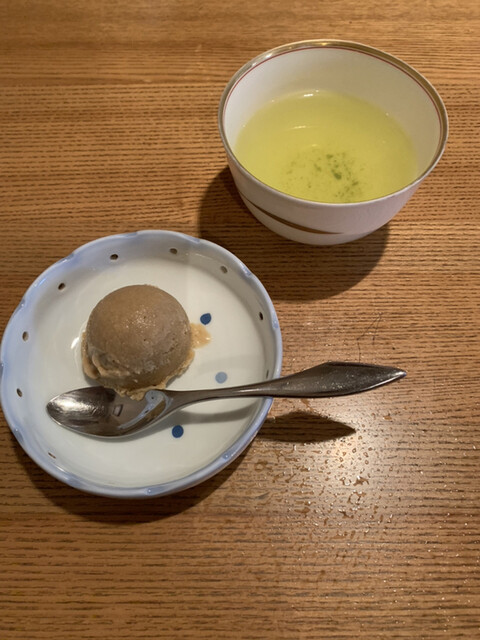 〆に緑茶が出され、黒糖アイスと合う合う。