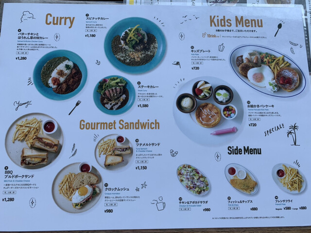 私は、バターチキンとほうれん草のWカレー 税込1280円、夫は、BBQプルドポークサンド 1280円、アップルコンポート&キャラメルソースパンケーキ 1680円、セットドリンク 280円をオーダーしました。