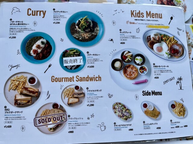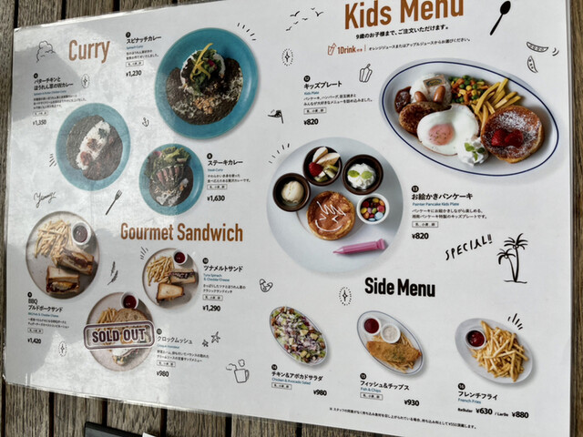 オーダーは、メキシカンチキンジャンバラヤ 税込1430円、ロコモコ 1430円、フレンチフライL 880円、期間限定 湘南ゴールドパンケーキ 1580円、湘南ビール 780円、ソフトドリンクは県民共済カードで1杯無料です。