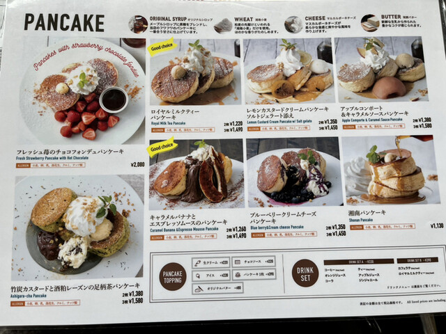 ペットOKのテラス席は40席もあり、屋根もあるので、もし雨が降っても大丈夫な仕様となっており、また、お食事注文の人には、440円で、一人分のパンケーキとドリンクもあるようなので、一人で来店しても優しいお店ですね。