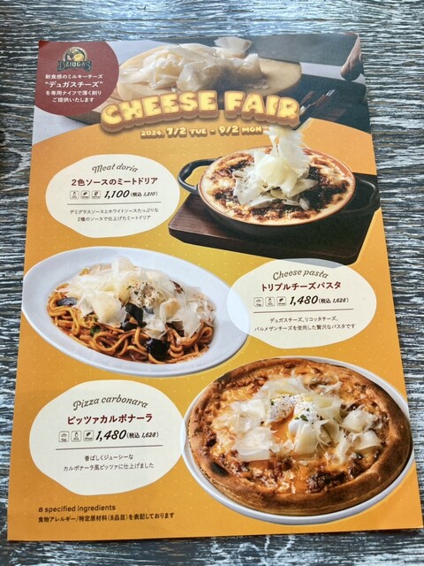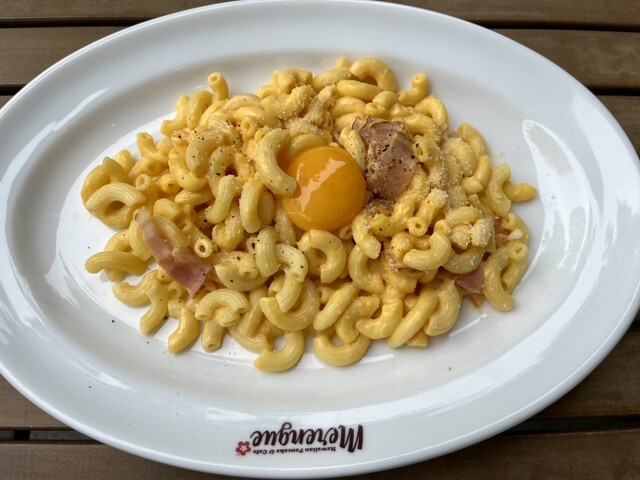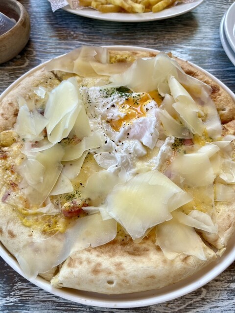 カルボナーラピザは、期間限定のチーズフェアで、目の前でチーズをのせてくださったり、半熟卵と、食べてみるとニンニクがとてもきいていて、とても美味しかったです。