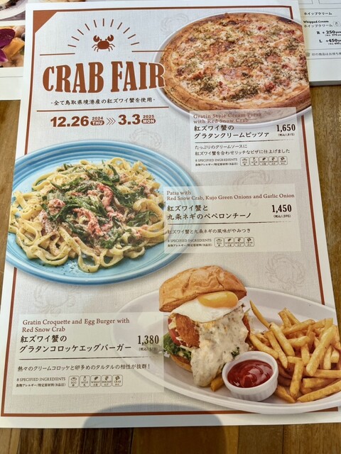 オーダーは、期間限定の紅ズワイ蟹のグラタンクリームピッツァ 税抜き1650円、マカロニチーズ 1290円、セットのミニサラダ 290円、フレンチフライポテト 450円、マカダミアナッツクリームパンケーキ 1490円、ドラフトビール 590円、白グラスワイン 290円、コナブレンドコーヒー 550円です。