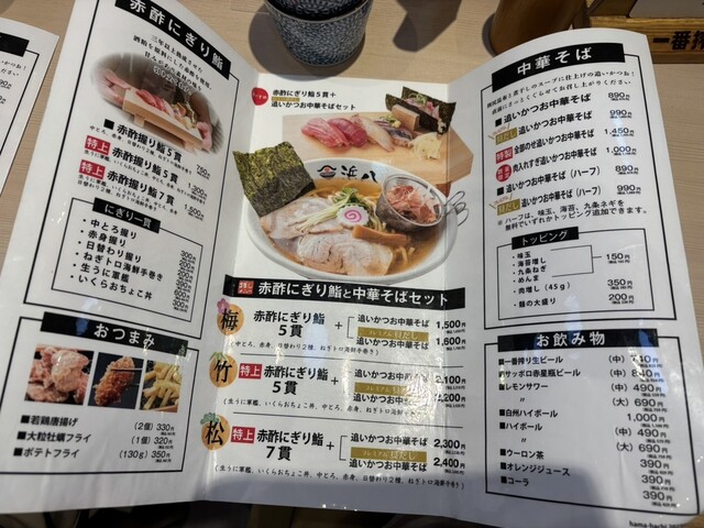 追いがつおのお出汁が深くて美味しいラーメンと、新鮮な赤酢にぎり寿司です。