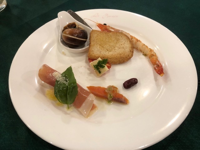 前菜は、海老・エスカルゴ・生ハム・サーモンのマリネなど。