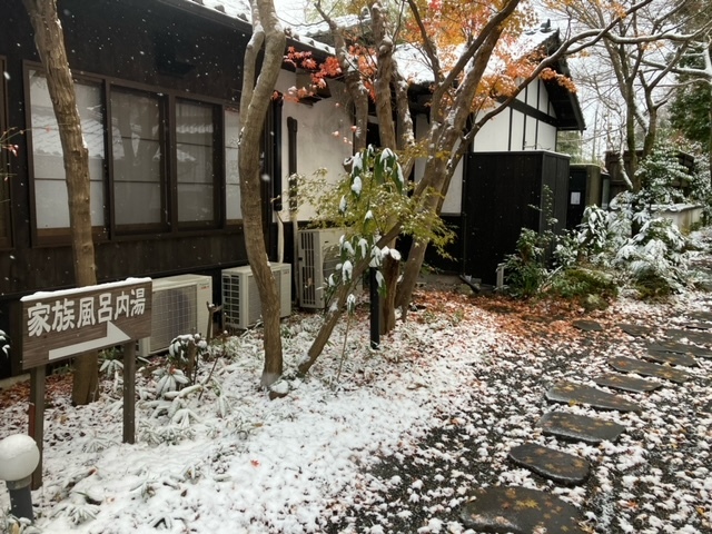 大満足の夕食。夕食後も雪が降る中、室内の露天風呂に浸かり一息。