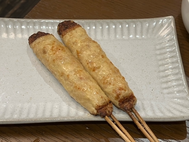 皮はぐるぐると串に巻かれていて博多名物の鳥皮に似ている。