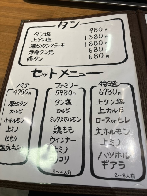 内容は、上カルビ・塩タン・とりもも・ホルモン。