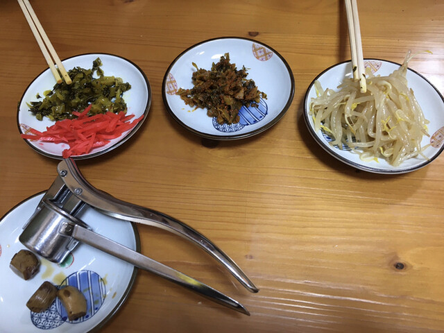 高菜(普通)、高菜(辛)、辛もやし、紅生姜
