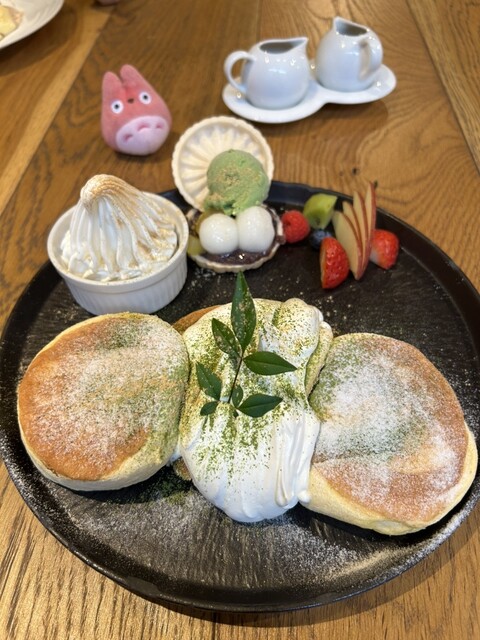 黒蜜と抹茶シロップと旦那のパンケーキに付いてきたメープルシロップも掛けながら味変!