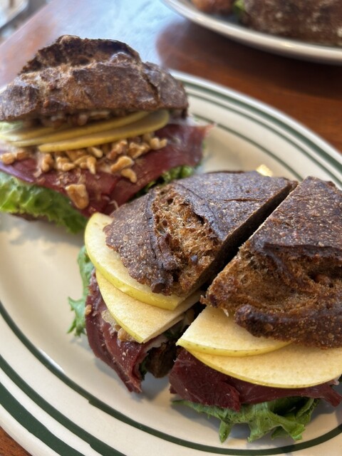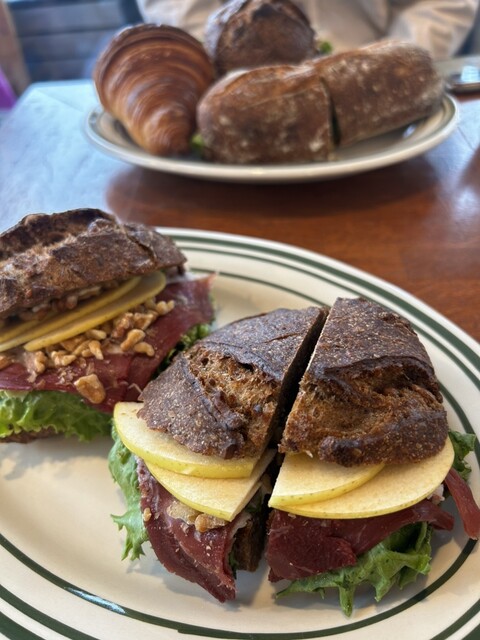 オススメとの口コミが多かった、鴨の生ハムと青リンゴのサンドイッチ、あとはクロワッサンが絶品。