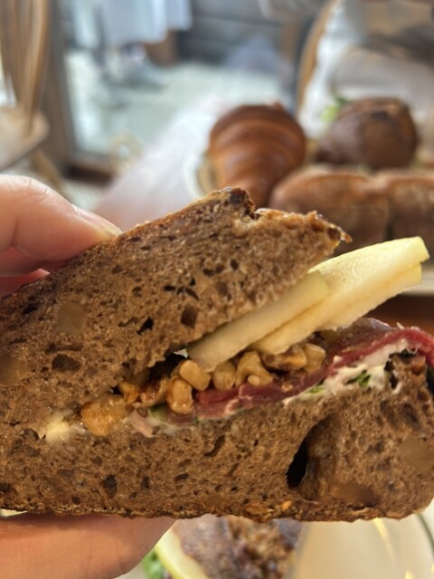 具材をまとめる美味しいソースと、くるみとパンの相性がたまらない!ほんのり甘くてモチモチで、雑穀の香りもたまらん。パンが苦手、ハード系はもってのほかの夫も、これは美味しく食べれたみたい。