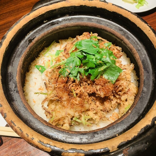 ・土鍋ご飯:結構な量でびっくり。かき揚げの下には鯛が隠れてました。食べれないだろうと思ってたら、あっさりしたお味で、おこげも絶妙。なんだかんだで全部食べてしまいました。