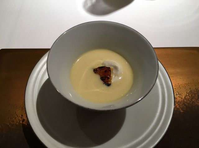 ・広島県三次産 九重栗南瓜の滑らかなポタージュ ポワトリーヌヒュメと香ばしいクルトンを添えて