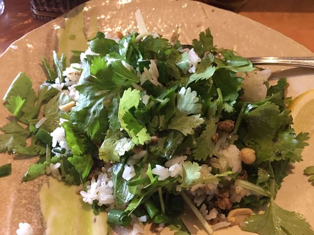 十分混ぜ合わせて食べてみると、パクチーの豊かな香りが、口いっぱいに広がり、爽やかさを感じる。その後に、挽肉の旨みと、後を引く辛さが押し寄せる。これは、美味しい。クセになる美味しさ。