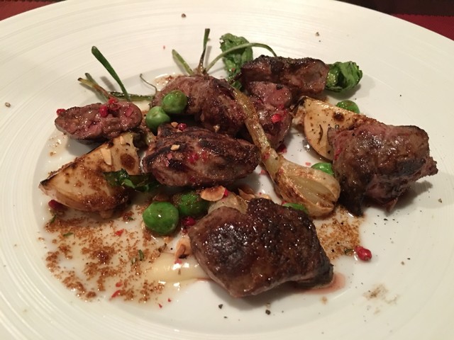 白レバーの炙り焼きに、エシャロットやカブを添えたもの。レバーは新鮮で、全く臭みはない。これも素晴らしく美味しかった。