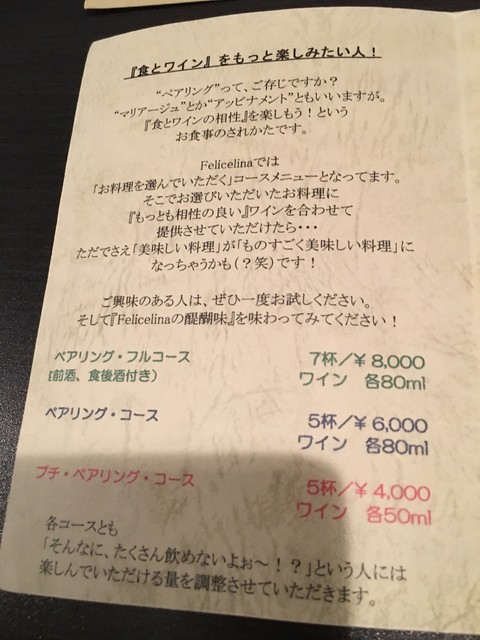 ワインは、どれもイタリアのワインで、飲んだことのないイタリアの土着品種のワインもあり、興味深かった。比較的安めと思われるワインが中心のため、ワインのみだと物足りなさがあるが、料理と合わせることで、美味しくいただくことができた。