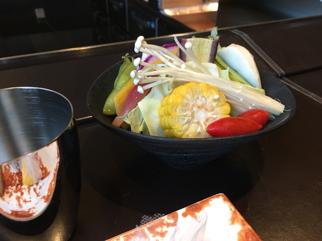 最初に出される生野菜は、適宜、手でつまんで食べる。野菜自体が美味しいので、軽く塩をつけるだけで、美味しく食べられる。