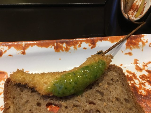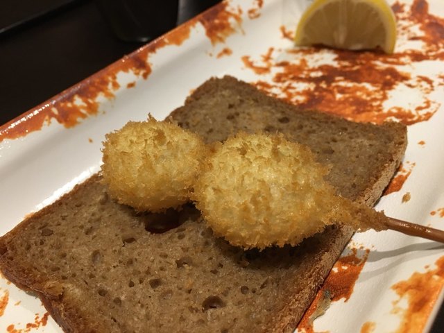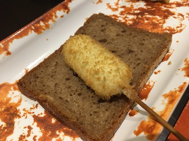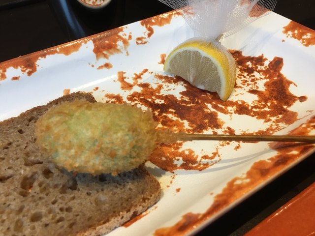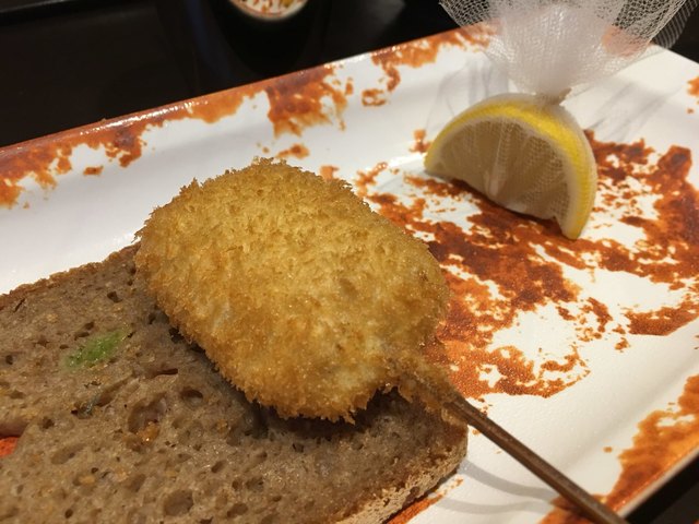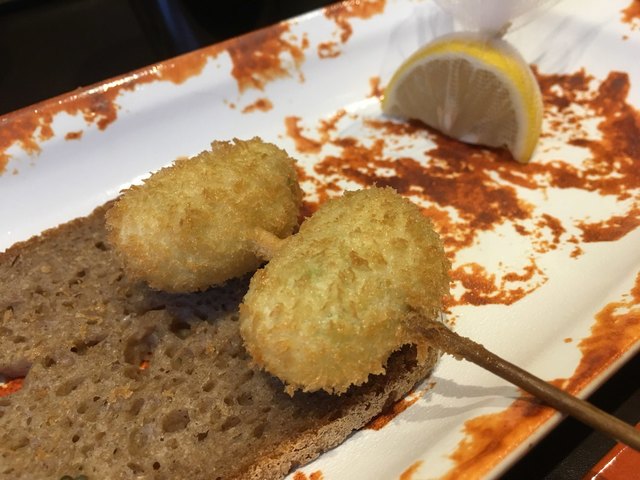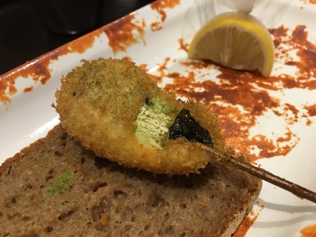 食材は、バラエティに富み、お決まりのものに加え、旬の食材も取り混ぜたもの。食材は、一仕事、二仕事してある。カウンターの目の前で揚げてもらった揚げたての串は、どれも美味しかった。