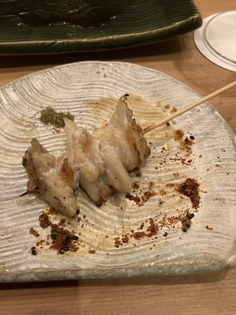 駅東口、徒歩5分もしない場所。坂とは反対側。遅く入店して、お任せ注文。落ち着いて広々としたカウンター。お任せは一気に食べあげる。ワインが美味しいお店。オードブルの後、一緒に以下の焼き鳥を。