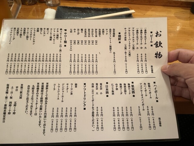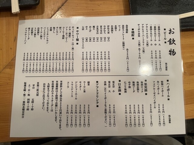 秋元屋の特徴で飲み物は口頭で、食べ物は紙に書いてオーダーするスタイルです。