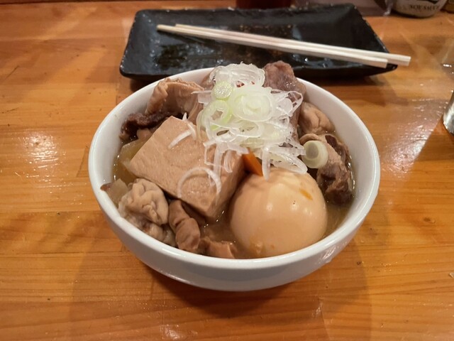 煮込みは秋元屋特有のあっさりしていて美味しい!もつ以外も豆腐やこんにゃくも入っていて豚汁っぽさもあります。モツはトロトロで美味しい!玉子はよく煮込んで美味しいです。