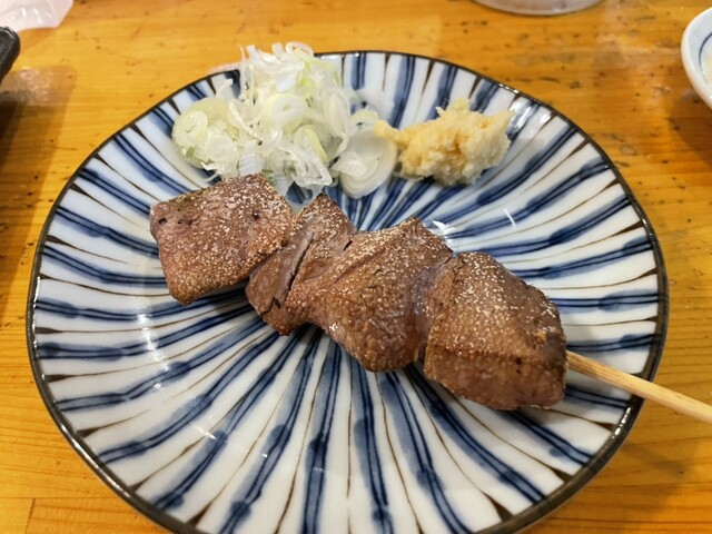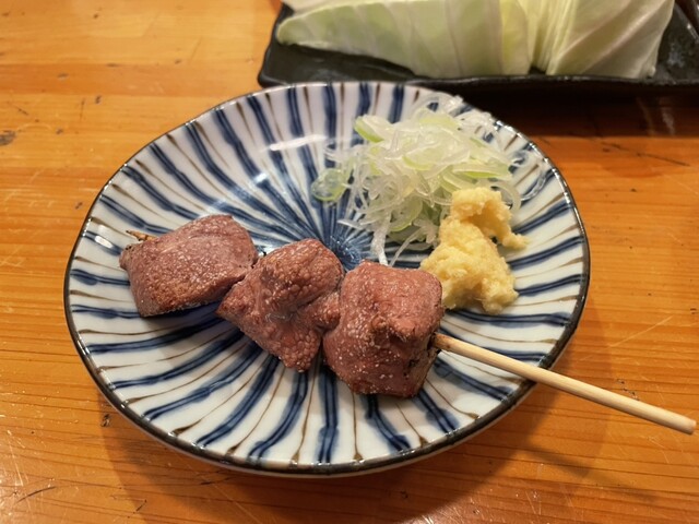 レバーは塩でごま油と生姜とネギで食べます。抜群の火入れで絶妙な柔らかさで美味い!以前は味噌一択だったけど、ごま油はやっぱ最高の組み合わせ!