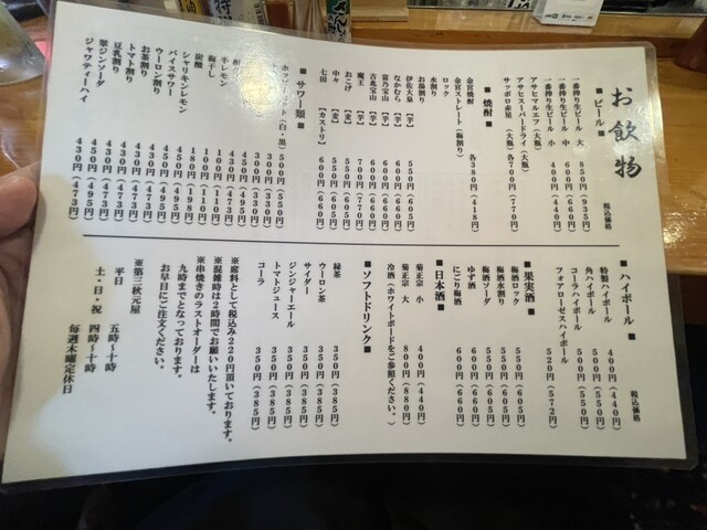 2階建てで、1階はカウンターメイン、2階はテーブルメインです。秋元屋の特徴で飲み物は口頭で、食べ物は紙に書いてオーダーするスタイルです。