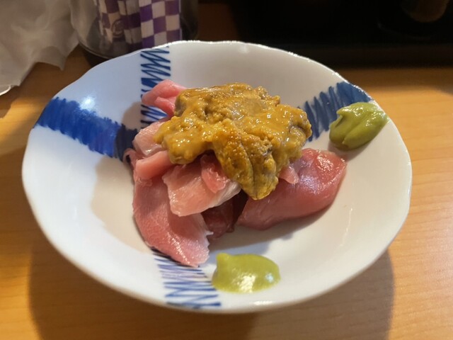 戸井産天然本鮪中落ち生雲丹乗せ 580円