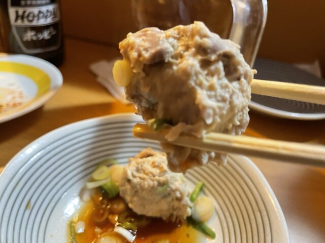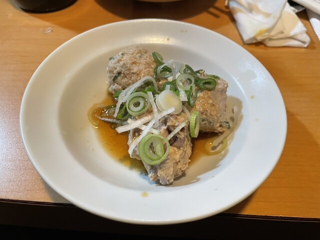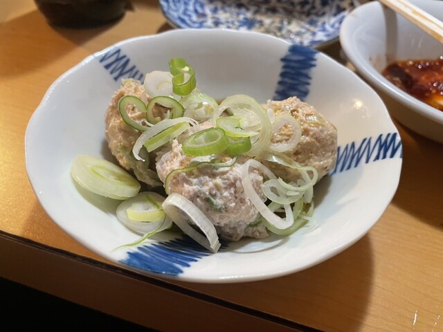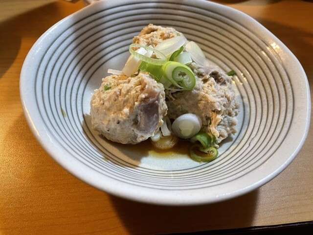 つくねは串じゃなくてお皿で出されるスタイルです。プリプリで美味い!歯応えが凄い美味しいです。ポン酢の味がして絶妙です。