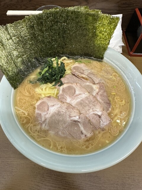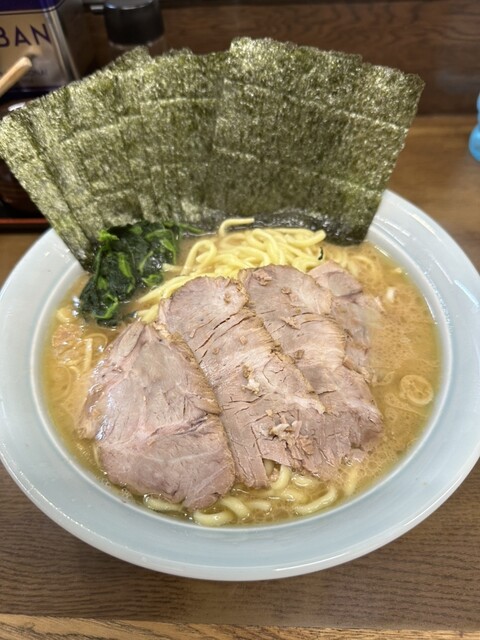 ラーメン中盛りかため、チャーシュー、海苔増しトッピング注文。