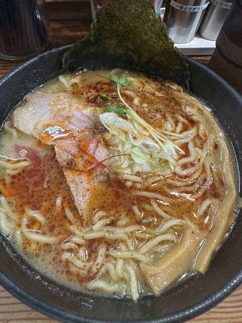 卓上。一味、ブラックペッパー、レモン汁、その他自家製ラー油がある。