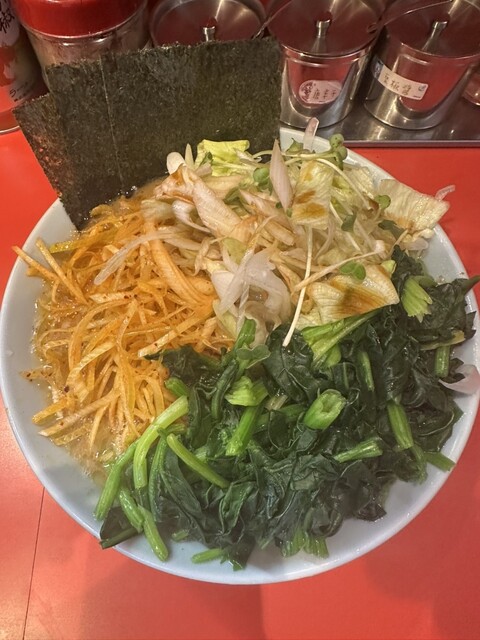 ◯ピリ辛ネギラーメン(¥1050)、中盛り(¥110)、野菜畑(¥150)、ほうれん草(¥150)をノーマルでのオーダーです。