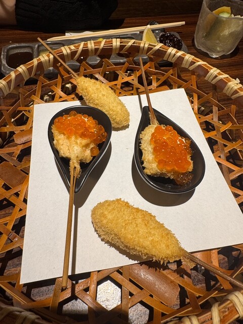 こちらでは、お店におまかせで串揚げが提供され続けます。1本の値段が400円ぐらいで定額になります。どの串も単品だとそれ以上の値段なのでコスパ良い価格設定です。お腹いっぱいになるまでどんどん提供されるので満足でした。