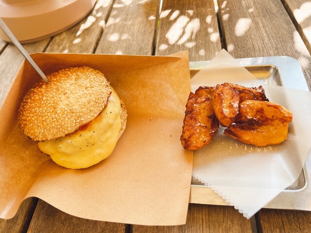 びよーんと伸びるチーズに、パテもたまねぎもバンズもシンプルながらに美味しくて、夢中であっという間に食べちゃいました。玉ねぎもだけど付け合わせのポテトが不思議なほど甘くて美味しかったです