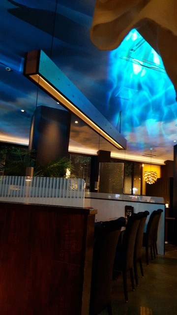 海水魚の水槽があり、天上は雲の柄。照明は暗め。