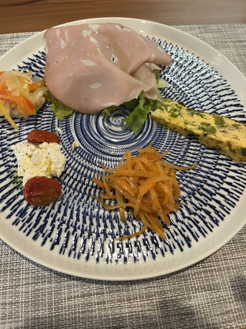 アペタイザーはその場でスライスしてくれたハム、自家製リコッタチーズ、ハーフドライのトマト、オレンジとキャロットの和え物などこだわった物ばかり。