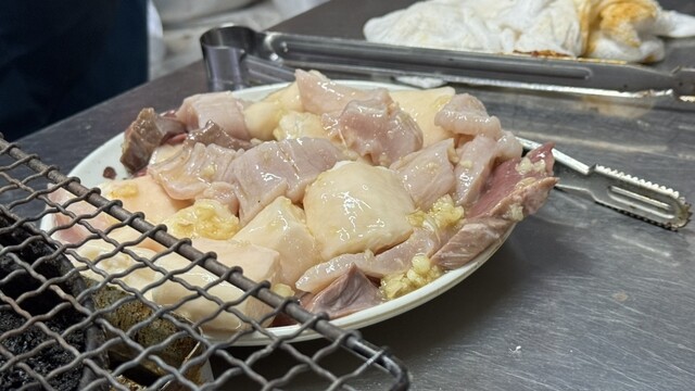 • 先ずは、タレにつけられたミノをお鍋に投入