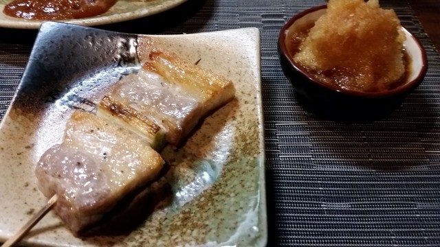豚バラ おろしじょうゆを乗せてくださいと。でっかい!あっつあつで脂が美味い!おろしじょうゆでさっぱり&やけど防止wちょっと醤油多かった。