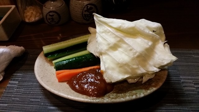 まずは野菜から、キャベツ・キュウリ・ニンジンにみそ。